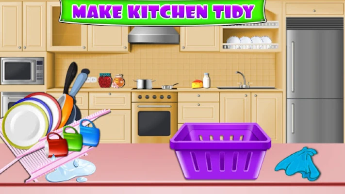 اس تفریحی کھیل میں، آپ کو گندے برتنوں کو دھونے کا چیلنج قبول کرنا ہوگا – سپنج اور ڈش صابن کا استعمال کرتے ہوئے انہیں صاف ستھرا کریں۔ دھونے کے بعد، برتنوں کو سکھانے والے میں رکھ کر خشک کریں۔ باورچی خانے سے ہر قسم کا کچرا اور گندگی کو کچرے کے ڈبے میں ڈالیں۔ بچے ہوئے کھانوں کو ری سائیکلنگ کنٹینرز میں منتقل کر کے ماحول دوست رویہ اپنائیں۔ گلاس، کانٹے، چمچ اور ٹرے جیسے تمام برتنوں کو دھونے کے بعد ان کی مخصوص جگہوں پر الماریوں میں ترتیب سے رکھیں۔ الماریوں کو منظم کریں، شیلفوں پر چیزوں کو دوبارہ ترتیب دیں، اور گندے فرش کو صاف ستھرا بنا کر اس کی قدرتی شکل بحال کریں۔