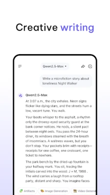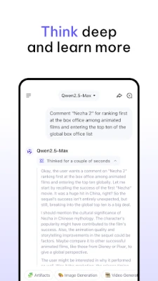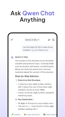 اپنی ذہین تلاش کی خصوصیت کے ساتھ، Qwen Chat ویب کے وسیع سمندر سے فوری طور پر جوابات، وسائل اور الہام تک رسائی فراہم کرتا ہے۔ اس کی جدید فلٹرنگ اور سیاقی تفہیم اس بات کو یقینی بناتی ہے کہ آپ کے سوالات کے درست ترین اور متعلقہ نتائج آپ کی انگلیوں پر ہوں۔ تحقیق ہو، نئی ترکیبیں دریافت کرنی ہوں یا رجحانات کا پتہ لگانا ہو، Qwen Chat آپ کو باخبر رکھتا ہے۔ مزید برآں، Qwen Chat آپ کی تخلیقی صلاحیتوں کو بھی جلا بخشتا ہے، چاہے آپ مضامین، کہانیاں، مقالے یا تحقیقی کام لکھ رہے ہوں۔ یہ نئے خیالات، تصورات اور غیر روایتی سوچ کو فروغ دیتا ہے، آپ کو اپنے تخلیقی منصوبوں کو حقیقت کا روپ دینے میں مدد فراہم کرتا ہے۔